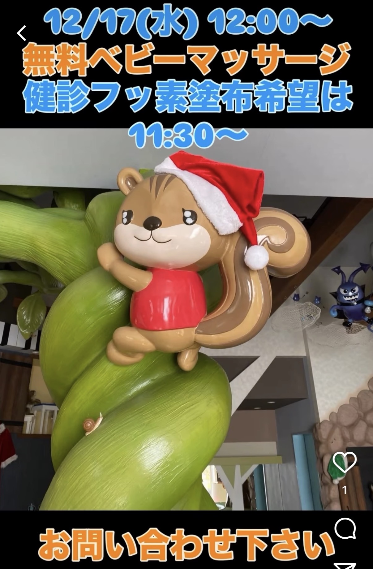 ♡ベビーマッサージのお知らせ♡ 2025/11/14 12月17日(水)12:00~ 無料ベビーマッサージ開催します!!(対象:1ヶ月健診後から一歳半ぐらいまで) 歯科健診、フッ素塗布ご希望の方は 11:30~ ※マイナンバーカードor資格確認書、子ども医療証 をお持ちください。 052-777-5788 までお問い合わせください。 ご参加お待ちしております!! 共有:Facebook